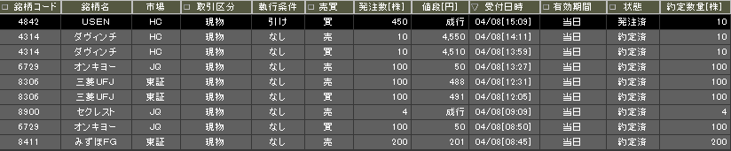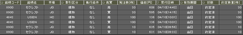 後場引け成りで4842を注文、10株ゲット。